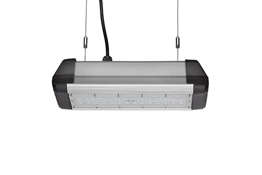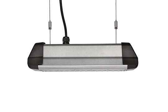 LED Hallenstrahler Gesamtleistung: 50 W, inklusive LED-Konverter, digital dimmbar - DALI. Gehäuse aus Aluminium matt, silber. Passives Thermomanagement. Abdeckung aus UV beständigem PC für anspruchsvolle Industrieanwendungen. LED-Lebensdauer 50.000 h. Umgebungstemperaturen von -30°C bis +45°C. Leuchten Lichtstrom: 5.000 Lumen bei Farbwiedergabe von Ra > 80, Farbtemperatur 5500K. Präzise Lichtlenkung über geschlossenes, optisches Linsen-System, Asymmetrisch breit abstrahlend, 30/100°. Eine umlaufende Dichtungslippe schützt vor Eindringen von Staub und Feuchtigkeit. Geschlossene Schutzart, IP65. Montage über Halteklammer oder abgehängt mit einer 2-Punkt Abhängung und vormontiertes 1,5m langes Anschlusskabel, Leitung mit freien Enden im Lieferumfang enthalten. Upgrade fähig durch Austausch von LED-Module und LED-Konverter.
